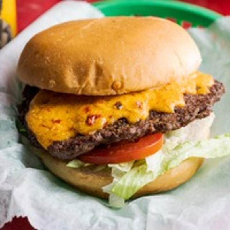 Signature homemade pimento cheese, lettuce, tomato, pickles, and onions on brioche bun