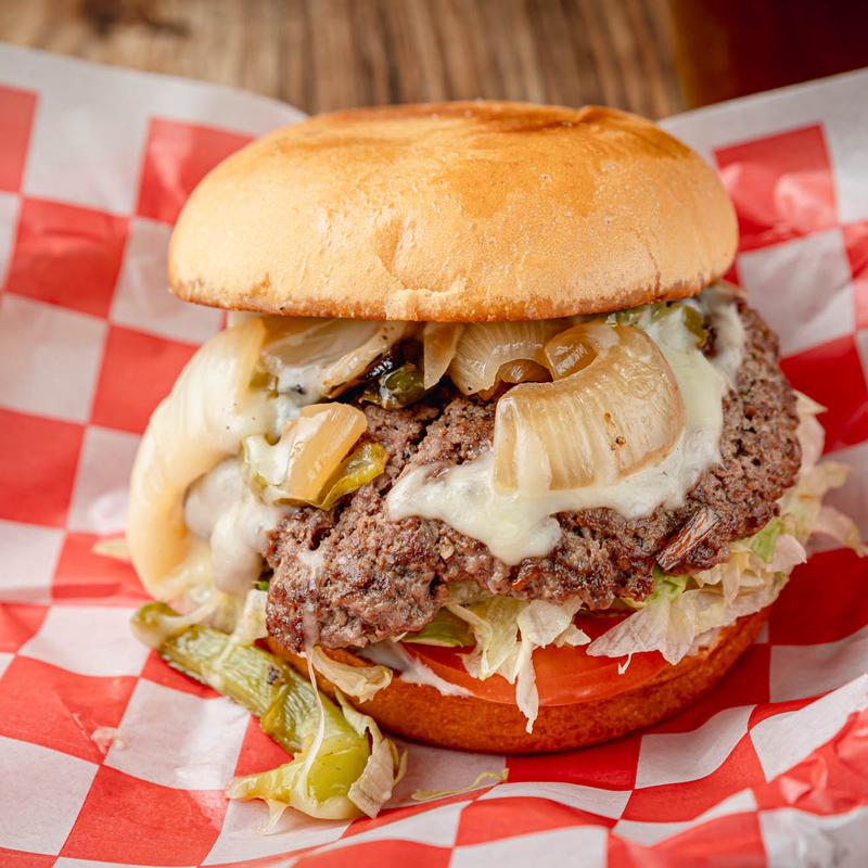 Spicy mayo, lettuce, tomato, grilled onions and peppers, Monterey Jack cheese on brioche bun