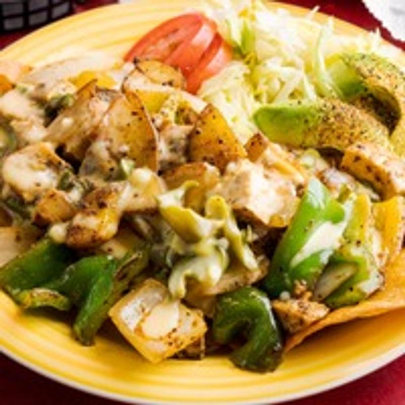 Golden fried flat tostada shells topped with a mixture of chicken, bell peppers, potatoes, onions, and queso served with tomato and avocado wedge