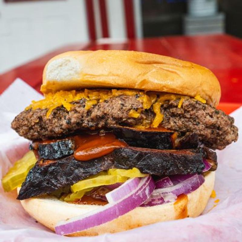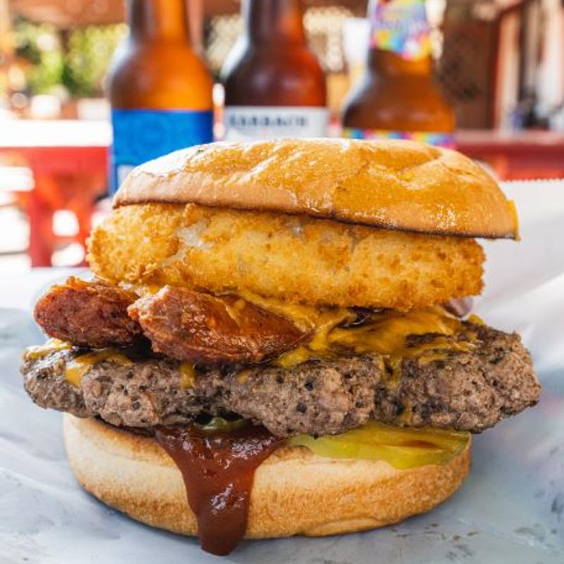 Onion ring, bacon, jalapeños, cheddar cheese, BBQ sauce, and ranch dressing on brioche bun