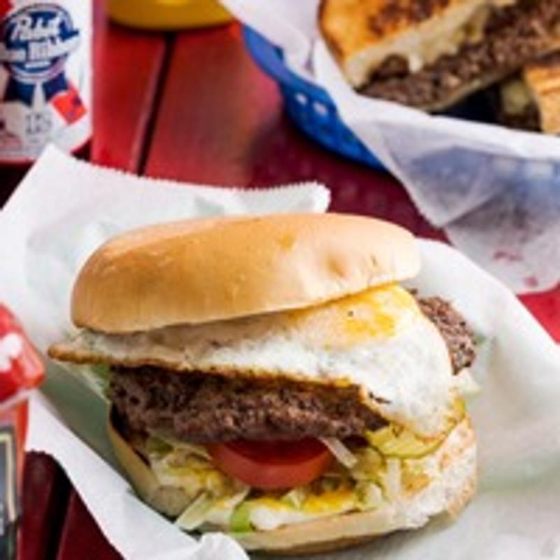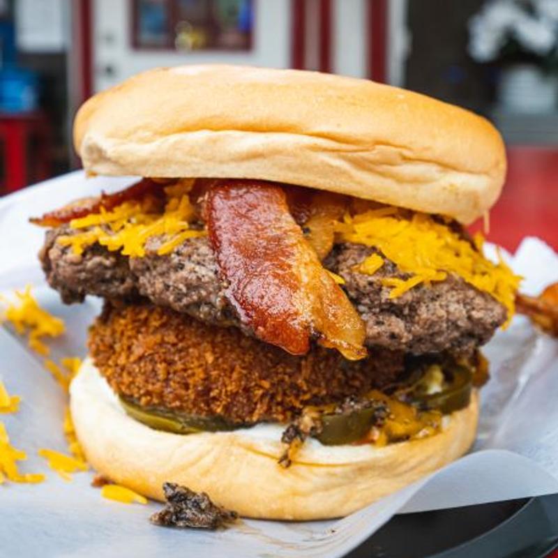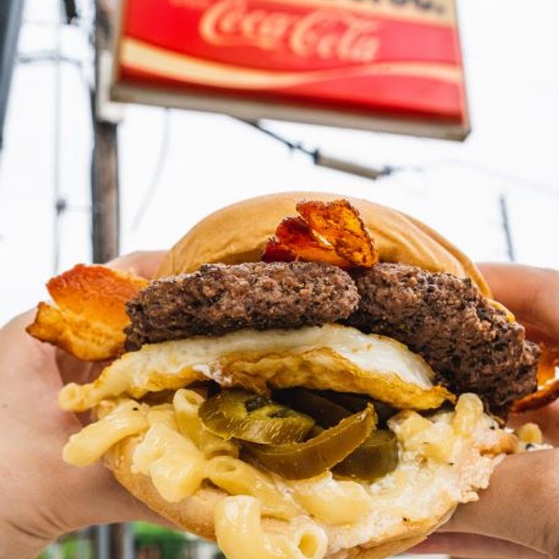 Habanero mustard, cayenne butter, bacon, sunny side up egg, mac & cheese, jalapeños, and cheddar cheese on a brioche bun