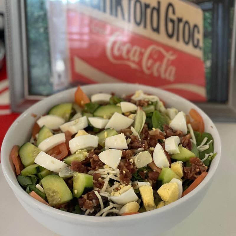 Lettuce mix, bacon, hard-boiled egg, tomato, cucumbers, and cheese served with your choice of dressing